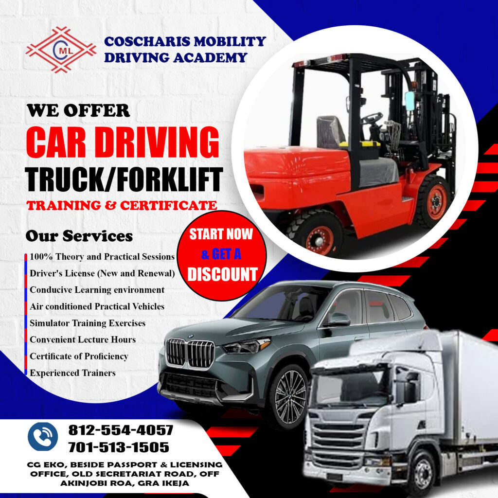 At Coscharis Mobility Driving Academy, we are dedicated to providing comprehensive and high-quality driving training and services. Whether you’re aiming to master truck driving, forklift operation, or standard car driving, or need assistance with driving license processing and renewal, we’ve got you covered. Our expert instructors and streamlined processes ensure you receive the best training and support.